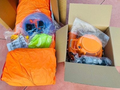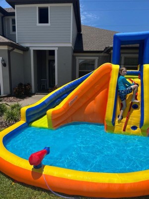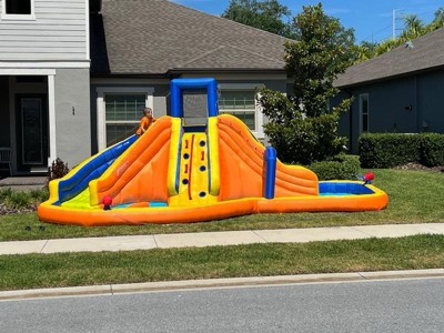[This review was collected as part of a promotion.] This thing is amazing. My kids were super excited from the minute it got delivered to our house. When I first opened the box, I was concerted that setup would take quite a while. However, it only actually took about 15 minutes. The worst part was waiting the hour and a half for the pool portion to be filled with enough water. As far as the actual inflatable is concerned, my kids love it. The two slides are great. There is no fighting over who gets to go first. The water blasters are an ingenious way to keep filling the water up to offset any lost to splashing. One thing to keep in mind: this thing is huge! As you can see from the pictures, it took up nearly my entire front yard. Make sure you have enough room to set up. I’m looking forward to years of summer use.