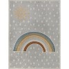 This cheerful rug features a minimalist sun and rainbow on a background of abstract raindrops. The washable, kid-friendly pattern is perfect for a bedroom, playroom, home office or family room. Made from pet-friendly synthetic fibers, this rug is easy to clean.