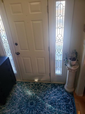 I bought this rug for my entryway and it looks awesome. It is water resistant.... we had a snow day and all of the snowy boots did well on the rug. I love the colors! This is just what I was looking for.