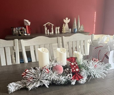 Northlight Triple Candle Holder with Flocked Pine and Christmas Ornaments - 32" - Red and White