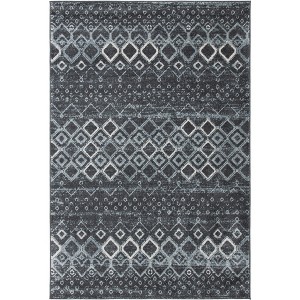 Elevate your home with this chic 4' X 6' small rectangle Bohemian style area rug. Crafted in Turkey using a power-loomed technique, it boasts a durable 100% polypropylene pile with a comfortable 1/4" height. The OEKO-TEX certification guarantees it's free from harmful substances. Its elegant dark grey/light grey palette is adorned with a harmonious blend of geometric patterns, adding a touch of sophistication and depth to any room. Perfect for high-traffic areas, this low-maintenance rug will effortlessly complement your contemporary decor.
