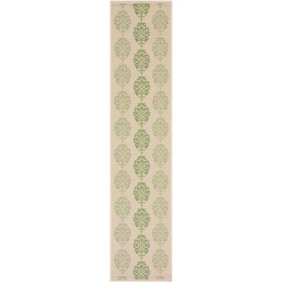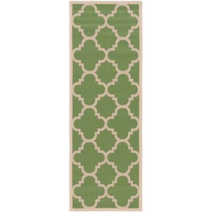 Elevate your home with our exquisite indoor/outdoor runner rug, meticulously crafted in the vibrant hues of green and beige for a harmonious blend with your decor. Designed for durability and versatility, this elegant 2'-3" X 12' runner features a sophisticated quatrefoil pattern that artfully combines classic charm with modern sensibility.