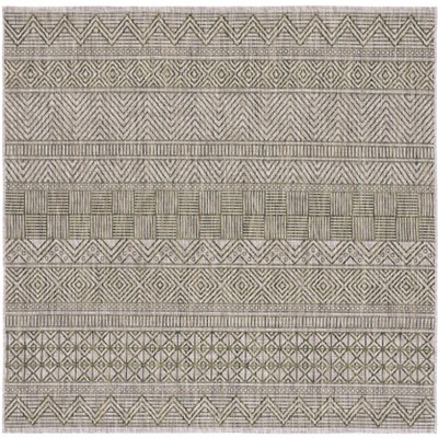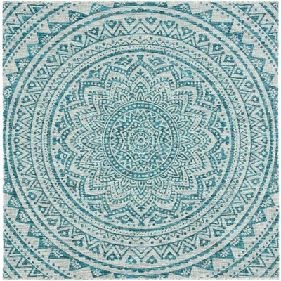 Enhance your living space with this elegantly crafted 6' 7" X 6' 7" square area rug, boasting a harmonious blend of grey and teal hues. The intricately designed rug features a tapestry of geometric patterns that display a fusion of traditional and contemporary influences, perfect for adding a touch of sophistication to any indoor or outdoor setting. Constructed using a state of the art power loomed technique, this rug offers both durability and a delicate texture with a height of 1/4", ideal for high traffic areas while still providing underfoot comfort.