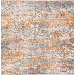 Elevate your living space with this striking square area rug. Measuring 9 by 9 feet, it seamlessly integrates into modern decor with its grey and orange tones and abstract pattern. Expertly power loomed in Turkey, this rug blends 57 percent polypropylene, 30 percent cotton, and 13 percent polyester to create a soft texture perfect for any room.