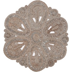 Discover the enchanting charm of our round grey area rug, measuring 5 feet by 5 feet. Artfully crafted in India, this hand woven masterpiece is made from natural jute, showcasing the beauty of artisanal craftsmanship. Its geometric pattern and bohemian style add a touch of free-spirited elegance to any room, making it a versatile addition to diverse interior styles. The rug's subtle grey tone provides a neutral backdrop, allowing it to blend seamlessly with your decor while highlighting the intricate geometric patterns. With a height of 3/8 inch, it provides a comfortable and welcoming feel underfoot. Embrace the distinct charm of this thoughtfully designed rug, which brings a harmonious blend of nature and artistry into your living space. Its carefully crafted elements evoke a sense of warmth and authenticity, perfect for those who appreciate the beauty of crafted works.