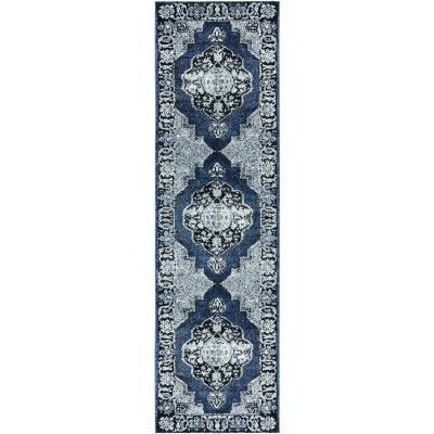 Crafted on a power loom using the finest polypropylene, this runner promises durability and ease of care, making it a practical choice for high-traffic areas. Its light blue and black palette is woven into a captivating pattern that features intricate geometric motifs and border details, reminiscent of classic Oriental designs with a modern twist.