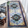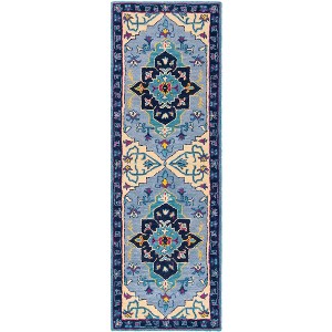 Crafted with meticulous attention to detail, this runner rug boasts a pile height of 3/8 inch, offering a plush underfoot feel that invites warmth and comfort into any hallway, entryway, or living space. The delicate light blue background is beautifully complemented by vibrant multi-color accents, creating a harmonious palette that enriches your room's aesthetic.