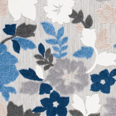 Featuring a harmonious blend of grey and blue hues, the rug's pattern is an intricate display of botanical elegance with blooming flowers and foliage, offering a sophisticated burst of nature-inspired beauty to any decor. Whether anchoring your living room, gracing your deck, or adding a touch of comfort to your home office, this versatile rug offers both style and functionality.