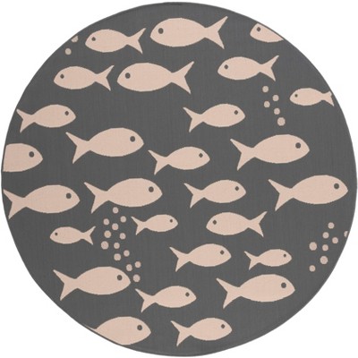 Introducing our exquisite 5'-3" X 5'-3" Round area rug, a perfect blend of functionality and style that's sure to anchor your space with a touch of maritime charm. Expertly crafted in Turkey using advanced PowerLoomed technology, this rug boasts a durable construction of 85.4% Polypropylene, 10.4% Polyester, and 4.2% Latex, making it ideal for both indoor and outdoor use. The elegant Navy and Beige color palette features a playful school of fish pattern that brings a serene oceanic vibe to any room or outdoor area. The rug's height of 1/4" offers a sleek profile that is easy to maintain and resists heavy foot traffic while still providing a comfortable surface underfoot. As an OEKO-TEX certified product, you can rest assured that this rug is free from harmful substances, ensuring a safe and healthy environment for you and your loved ones. Whether it's placed in your living room, patio, or by the poolside, our round area rug is the perfect way to infuse your space with both style and durability, reflecting the beauty of the sea wherever it's laid.