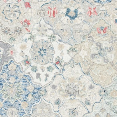 Elevate your living space with our exquisite hand-tufted wool area rug, crafted in the heart of India. This 6' x 9' medium rectangle rug boasts a stunning ivory backdrop that is beautifully punctuated with vibrant red accents, harmoniously blending with soft blues and neutral tones to create a refined and intricate pattern that is sure to catch the eye.