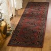 The rug's traditional pattern features a series of medallions, surrounded by intricate borders, giving it a classic look that is both stately and inviting. The palette is dominated by deep reds, complemented by accents of green and beige, providing a regal and sophisticated appearance that will enhance the decor of any room.