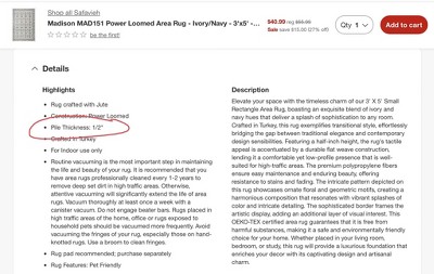 This area rug is listed as 1/2" pile, which it is not. It measures at ~1/3" which makes a difference. I cannot get the chemical odor from this thing out of the room. It has to be stored out of the house until I can return it in person. It cannot be returned via shipping although it was an online purchase, not sold in stores. Fedex and ups will only accept the pick up if it is in a box, regardless of having the original plastic packaging.