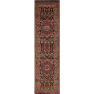 At a versatile size of 2'-2" X 4' and comfortable pile height of 3/8", this accent rug is ideal for bringing warmth and character to smaller areas such as entryways, beside the bed, or in a cozy reading nook. The navy and red hues, enriched by a legacy of design, create an inviting and sophisticated atmosphere.
