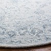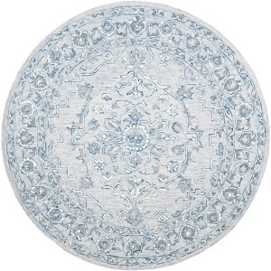 Transform your living space with this elegant round area rug, measuring 5 by 5 feet. The delightful light blue and ivory palette brings a serene touch to any room. Hand tufted in India with a blend of wool and cotton, this rug features a subtle 1/4 inch height, creating a comfortable surface underfoot. Its traditional style, combined with an intricate oriental pattern, adds timeless charm and sophistication to your decor. The inclusion of latex enhances its durability and grip, making it an ideal addition to high-traffic areas. Embrace the beauty and craftsmanship of this carefully woven piece and elevate the ambiance of your home.