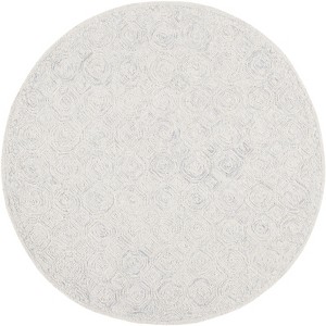 Elevate your living space with this charming round area rug, measuring 5 feet in diameter. Its silver and grey tones, paired with a geometric pattern, embody contemporary style and blend effortlessly with modern decor. Crafted in India using a hand-tufted technique, this rug combines the durability of wool and cotton with a touch of latex. With a height of only a quarter-inch, it offers a sleek profile that is perfect for any room in your home. Add a sophisticated touch to your space and enjoy the artistic impact this rug delivers to your surroundings.