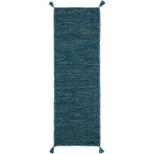 Elevate your space with this stunning runner rug, expertly hand woven from cotton and originating from India. Measuring 2 feet 3 inches by 9 feet, this rug is ideal for adding a touch of elegance to a hallway or entryway. Its blue and black tonal color scheme complements a variety of decors, making it a versatile choice for any home.