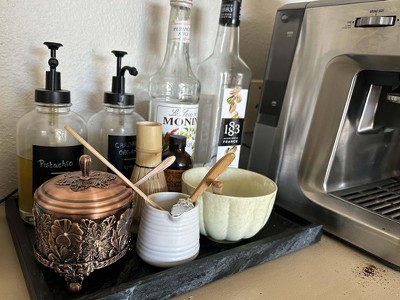 Picked this up for our coffee station to hold syrups and it ended up being exactly what we needed. The weight is the first thing you notice: it’s real marble, so it stays in place and doesn’t slide around when grabbing bottles. The raised edges are actually useful too, especially with taller syrup bottles, since it keeps everything contained and prevents small spills from spreading. Size works well for a few bottles without looking cluttered. It makes the whole setup look more intentional instead of just having items scattered on the counter. The black marble looks clean and a bit more high-end than expected. It pairs well with glass bottles and coffee gear without clashing. We’ve been using it daily and it’s held up well so far, no visible scratches, and easy to wipe down if there are drips or residue. Only thing to note is it has some weight to it, so it’s more of a “set it and leave it” piece but that’s part of why it feels solid. Overall, it’s a simple upgrade that makes a coffee station look way more put together without much effort