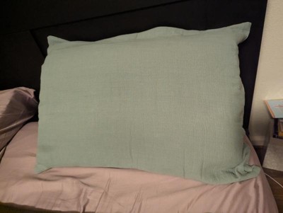 I ordered a pair of these to put in between my king size pillows and throw pillows on my king size bed. They are the perfect bridge between the two! The matelasse fabric is nice and soft. The subtle texture adds interest but doesn't compete with the throw pillows I already have. I like that the envelope closure on the back is generous so that the pillow won't peek out in the back. I just need to get some fluffy new inserts now so that they look full! The color worked perfectly with the drapes and pillows I already have. It's a dusty sage color but not a yellow sage. It's more gray. Really pretty color! Great buy!