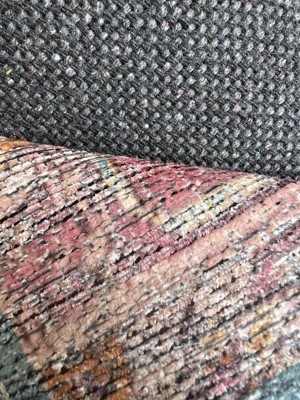 [This review was collected as part of a promotion.] This is such a pretty looking rug! I used a rug pad underneath it so that it stays put. The pattern is very mesmerizing to look at and it has really brightened up the look and feel of my room. It is machine washable and is very easy to clean.
