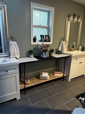 Gorgeous console. Beautiful colors and nice design. Looks expensive. Very stable and sturdy. Easy to assemble. Narrow, long and very functional. Fits perfectly in my daughter’s bathroom, but would be great for hallway or living room as well. Quite happy!
