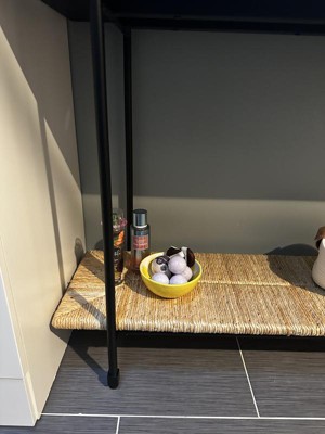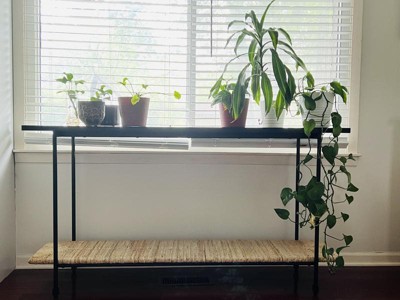 This table is beyond adorable and l love the weaved bottom shelf. It is very boho chic with a sophisticated feel. The top shelf is black and extremely durable. It will likely be a plant stand before too long but for now is a cute decor table for my gnomes and mushroom decor.