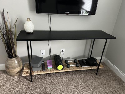 This table was the perfect addition to our home gym/yoga studio! It is very heavy and extremely sturdy. The shelf on the bottom is solid under the wicker and reinforced with metal bars underneath making it strong enough to hold a few dumbbells. It was also very easy to build - took about 15 minutes - and came with all tools needed.
