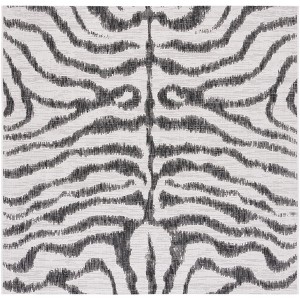 Elevate your living space with this stunning 6'-7" X 6'-7" Square ivory and black area rug, a perfect blend of modern sophistication and high-quality construction. Drawing inspiration from organic patterns, this piece showcases a bold zebra stripe motif that creates visual intrigue and timeless style. Expertly crafted in Turkey using power-loomed technology, this rug boasts a low pile height of 1/4" for a sleek profile and easy maintenance.
