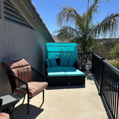 Costway Patio Rattan Daybed Lounge Retractable Top Canopy Side Tables Cushions Black + Turquoise
