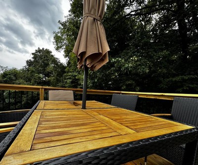 Table is warping now due to weather. We’ve only had it since this summer season. I️ can’t imagine what it will look like by the end of next summer. Definitely keep it covered from weather if you plan to buy. I️ do love the look and sturdiness. Also I️ loved that it came with cushions for the chairs!