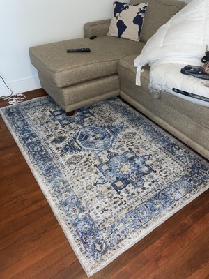 I bought this rug to put over part of the light-colored carpet in my family room that gets lots of traffic. I figured it would prevent lots of dirt on the carpet that would require carpet cleaning. This way I can just throw the new area rug in the washer to get things looking great again. The blues in the rug are so bright and pretty and go so well with similar accent blues in the room. It makes me happy every time I look at it. Rug came quickly did not have any creases in it. Very happy with the purchase.