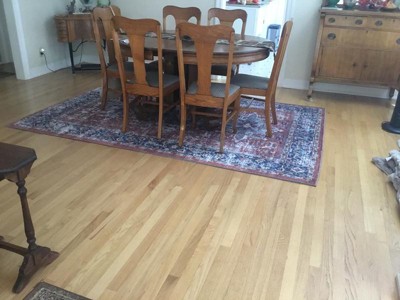 I love this rug. It looks fantastic under my dining room table. It lies completely flat even the corners . The colors look great together and looks like it will be easy to keep clean. I love the fact that it can go in washing machine when the time comes.
