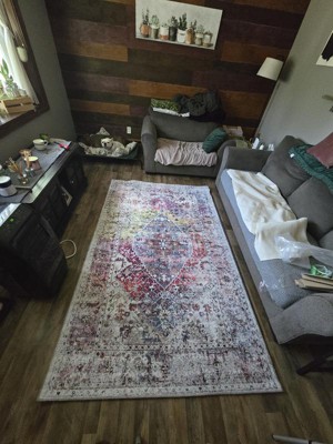 I love this rug. The colors are so fun and vibrant, it brings my living room together. It lays perfectly flat on my rug pad, and my dogs love laying on it because there's no nap. Haven't washed it yet, but I don't see an issue tossing it in the washer.