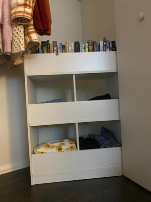 This took about an hour to assemble but was easy to do (even with toddler “helpers!”) I wish the shelves were deeper. It it’s limited in terms of what it can hold. However, it would be great for a small space. I think I will move it to our baby’s closet for clothes and extra sheets. It matches any decor and is HEAVY and seems high quality for being particle board.