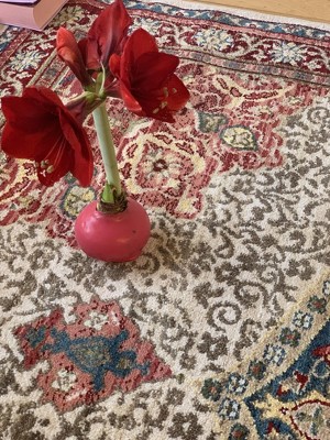 Lively rug! Very soft, settles flat in a day or two when weighed down by books. Only complaint is that it's more pink than red in well-lit areas and how slippery it is on hard wood floors - you may need a mat under it or heavy furniture.