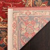 Adorned with a captivating pattern that exudes a blend of tradition and modernity, the rug's plush surface showcases a rich red base intricately patterned with sophisticated motifs in contrasting navy. These colors together create a warm, inviting ambiance and a sense of depth that will enhance any room.