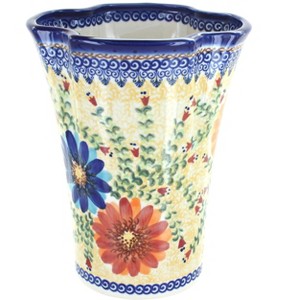 This large vase is the perfect way to showcase a beautiful bouquet of flowers, adding both elegance and artistry to your home décor. Standing 8 inches tall and 6.5 inches wide at its widest point, it is generously sized to hold full floral arrangements while maintaining a graceful silhouette that complements a variety of spaces. Handcrafted from durable, high-fired ceramic and decorated in traditional Polish pottery patterns, each vase is individually hand painted, making every piece a unique work of art. The vibrant colors and intricate details bring timeless charm to your table, mantel, or entryway, while the smooth glazed finish provides durability, resists stains, and ensures easy cleaning. Ideal as a centerpiece or accent piece, this vase looks just as lovely on its own as it does filled with fresh or dried flowers. With its classic shape and bold hand painted design, it also makes a thoughtful gift for birthdays, anniversaries, housewarmings, or any special occasion. Functional, decorative, and full of character, this handcrafted vase is a lasting addition to any home.