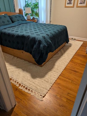 [This review was collected as part of a promotion.] I was a little worried about the tassels tripping us up when we got this but it flattened out within a couple of days and causes no problems. Pile is soft on the feet when getting out of bed. I'm super happy with this purchase and plan to buy a smaller rug for our closet too!