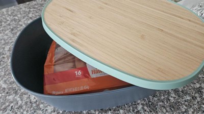 [This review was collected as part of a promotion.] ✨ Leo Bamboo 12.5" ✨ Covered Bread Box & Cutting Board -12.5" natural bamboo bread box with Cutting board lid -Pre-seasoned with vegetable oil with a food-grade plastic cutting board lid. -Fits 1 full size loaf of bread with extra space. -A bread box is something I never knew I needed until I had one. Usually my bread is just sitting on the counter or stuffed in my island storage. This bread box is colorful and sleek and looks so much better on my counter than a loaf of bread. A full size loaf fits perfectly in it. Even with a full loaf, I was also able to fit my wraps on top and a loaf with a few pieces left of the side of that full size loaf. Bread boxes are suppose to keep your bread fresher longer, so I am definitely looking forward to having my bread last longer before I need to toss it. I also love that the top of this doubles as a cutting board. Multi-functional products are the best.