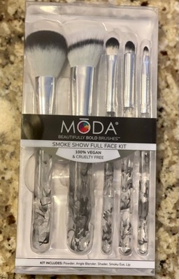 [This review was collected as part of a promotion.] The MODA smoke show face kit in white comes with five different brushes. A Powder, angle blender, shader, Smokey eye and lip Brush. The handles are clear with a black Smokey design. All five handles are unique. The brushes are vegan and cruelty free. The brush feels so smooth and soft on your skin. Applying makeup everything goes on smooth and I'm able to blend thanks to the brushes. The MODA brushes can be used wet or dry. The handles are waterproof. Cleaning the brushes is easy. Gentle shampoo with lukewarm water, lay flat to dry. I am very pleased with the MODA smoke show face kit.