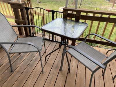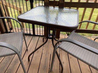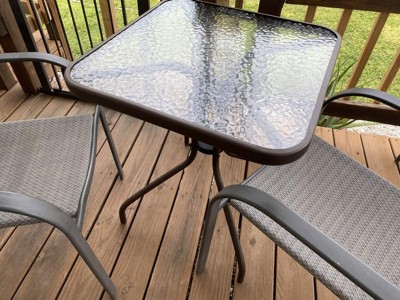 [This review was collected as part of a promotion.] I’m so happy with my new patio table. It’s perfect for two people. It’s a great addition to my patio table that sits four. Now I can sit more guests. This patio table will be used on our deck. The table has tempered glass and made of metal. The tempered glass is easy to clean. All hardware and a tool is included in the box. Assembly was very easy. Instructions are also included in the box. The table is about 130 pounds. The ends of the legs have a rubber tip to protect flooring. I’m excited that I’m able to have more sitting room for friends.