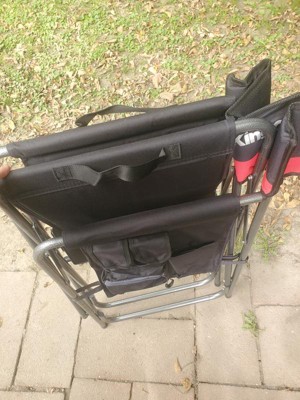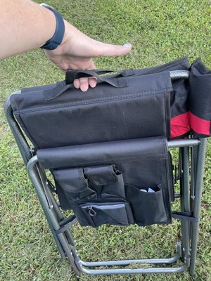 [This review was collected as part of a promotion.] KingCamp Padded Outdoor Folding Chair with Table & Pockets, Black/Red (2 Pack) is a heavy duty chair. It can hold 400 lbs and feels sturdy. I am under 200 pounds and can criss cross my legs in it and not feel like it will tip. It's easy to get in and out of. It is heavy and can't just be flung over your shoulder to free up your hands. That the only drawback. I did not get the bag in the picture but the chair wouldn't fit in it anyway. I don't know what the bag is for.