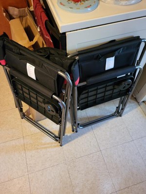 [This review was collected as part of a promotion.] I enjoy sitting out by the fire on cool evenings while enjoying the outdoors. These chairs are surprisingly lightweight and easy to carry with the handles built into the chair. I thought it was going to be hard to fold up after use, but I was able to fold it by pulling up on the seat (which I found to be an easier way to fold it up after use), although the diagram that comes with it seems like it shows pushing the frame together. The description said it can hold up to 400 pounds, which I was surprised by, but it held my weight just fine, and I weigh a little over 200 pounds. I like the cup holder and the side pockets are nice to put your cell phone or other small items in. I would recommend these chairs if you want a comfortable but easy to move seat.