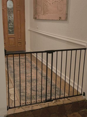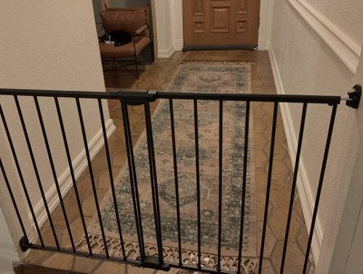 This baby gate is great for large walkways. It’s also very nice looking and doesn’t stick out like a sore thumb. So I’m really happy with how it looks. We use it in the hallway to keep the baby from entering in to the rooms. It’s very sturdy and was easy to assemble. I can open it with one hand, which is a must for me when holding the little one in my arms. Came with all the hardware needed for installation. The style looks great in my home. This gate can be used at the top of a stair case also. Very happy with the look and how easy it is to open with one hand. It’s built very well and will last me a long while.