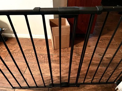 Nice sturdy gate. Our install took some extra thinking and planning due to a weird stair setup where the two banisters at the top are not aligned to each other, so I had to add wood to one banister to have it line up with the other one. I got a $3 2x3 piece of wood cut into two banister-height planks at my local hardware store and attached each to a banister using 3 1/2 in wood screws. I also used a $10 roll of vinyl "peel and stick" furniture wallpaper to wrap the planks so that they match my black banisters, this was a lot less effort than staining/painting the wood and the color is close enough, for about the cost of materials. I am very happy I didn't buy a $35 "banister kit" made of cheap zip ties and thin strips of wood or similar ones that use a plastic clamp. Drilling into the banister is so much more solid and solid than these other temporary approaches. Filling in the screw holes with wood filler later on will be easy and inexpensive. Once I had the wood set up, the gate itself took me about an hour to install and adjust properly. We are very pleased with the end result. The gate is very sturdy, blends into our banister very well and looks very nice and stylish. It is very easy and smooth to open and close.