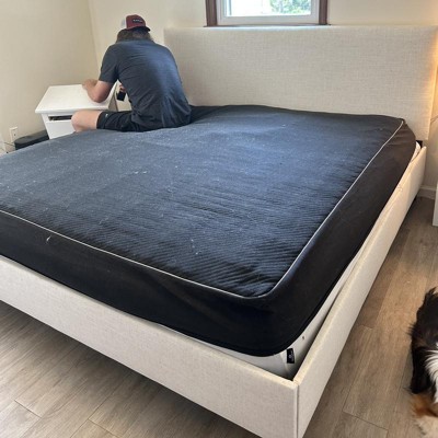 Recently bought this bed based on other reviews, I think this might be helpful for others. We really like this bed and are excited about it! Its a great find a great price...sometimes if you can, wait a few weeks and might go on sale, we got lucky and got it on sale. We got a 12 inch mattress to go inside, ordered the Lucid brand mattress from Target, this is my second Lucid mattress from Target and overall, very happy with it. We got the king bed frame. Even with the 12 inch mattress though, it does sit a little lower than we'd like, we might get a few inches box spring or mattress toper to help with the height. The material looks very expensive and chic (we ordered the light creamy, ivory color). It is very soft but also firm and doesnt look like it'll snag and will clean easily. Overall, very easy to build, took about 2 hours. The directions were easy to follow (words and pictures). Also know that you'll use bolts and screws for different parts of the building process so try and keep everything together as best as possible. I would recommend using a drill to make sure everything is tight and secure. You need to pull the slats really tight to make it fit but it'll eventually match up with the holes. Also, the wire frame itselfs looks smaller than we thought but dont worry, it's plenty big once the sides of the bedframe are added on. The corners of the frame dont fully match up, there's a little bit of a gap and you can adjust the headboard to however you'd like too on height, we ended up moving ours up so there is a gap in the back of the bed where the headboards meets the frame, this isnt ideal but a personal choice. We are very happy with this bed and very glad we got it and hope this review and photos help.