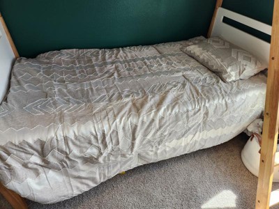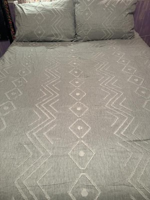 This is a great comforter. It feels lightweight but is still very cozy. It came vacuum sealed but fluffed up fairly quicky. I really like the tufted embroidery detail. It looks nice but doesn't have a scratchy feel to it. The underside of the comforter has a smooth like feel to it. I have a twin sized comforter and the picture I have shows it laying on top of queen size bed. I also have a picture of the comforter laying next to my true to color gray sheets. The twin size comforter is supposed to come with one pillowcase but mine did not. That's a bit of a downside as it would be a nice set.