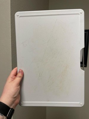 I was really excited to find small-kitchen friendly cutting boards and immediately purchased them! Unfortunately....they suck. The pros? They nest well, the container that they come in is really well balanced, and it takes up very limited space on my counter or in cabinets. I have only had these for about 6 weeks and they are WRECKED. As you can see in the individual photo, they are scarred like crazy (I don't want to think about how much plastic I have ingested) and they hang onto vegetable colors like whoa (that photo is from AFTER a soak and a trip through the dishwasher). I hate these and cannot recommend them.