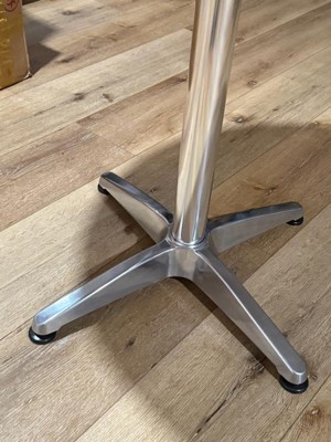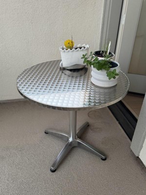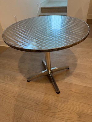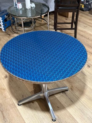 The perfect bistro table. Some fool wrote a review claiming that the table he ordered with a silver top arrived with a blue top. He didn't realize that it has a protective film that you remove when you get it. That was the only negative review and it was mistaken. As I said, the perfect bistro table.