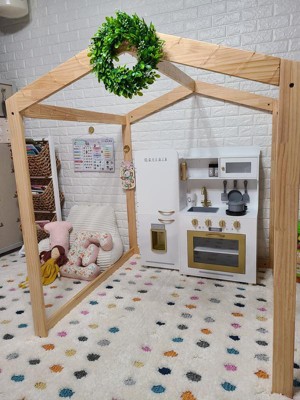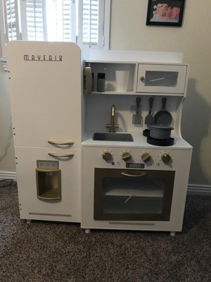 [This review was collected as part of a promotion.] The Teamson Kids Little Chef Mayfair Retro Play Kitchen is my new favorite addition addition my children's playspace. As a huge fan of vintage appliances and decor, I was delighted to see that Teamson designed a play kitchen that is realistic, simple and functional for my children. Although I was initially overwhelmed by the many pieces prior to assembly, the direction for this kitchen were really simple when following each individual step. From start to finish, it took me about 45-minutes to assemble this product. Components are labeled alphabetically, and hardware, numerically-- making it simple to follow assembly instructions. As with almost all of my larger wooden toys, some minor imperfections in the wood are visible (a tiny split coming from one prefabricated hole prior to utilizing screw). I do find that the surface of this kitchen scratches fairly easily, although the small black scratches seem to wipe off with a bit of pressure and cleaning with a microfiber cloth. My 4-year-old and 2-year-old daughters absolutely love to engage in pretend play for hours with the Teamson Little Chef Mayfair Retro Kitchen. Although classic and simple in design, the oversized fridge, gold trim and accents, and unique shape make this retro kitchen the focal point of any room. I love that the icemaker is functional, and that the burners make sounds while cooking. The stove knobs do click and turn to mimic real life and this kitchen comes equipped with a cup, realistic ice cubes, cooking utensils and a pot and pan. kitchen was a perfect addition to our playroom, as it is smaller than some of the other play kitchens on the market. The Teamson Little Chef Mayfair Retro Kitchen is really an all-around aesthetically pleasing, fun, and well-made option for the little chef(s) in your life!