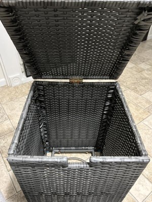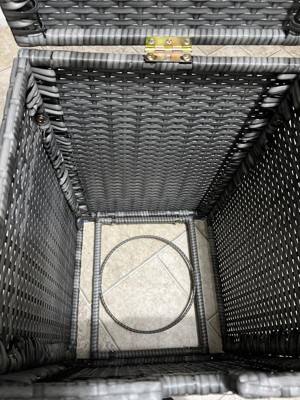 [This review was collected as part of a promotion.] I do not usually attempt to assemble items that require assembly by the purchaser. I decided to try to assemble this Teamson Home's Wicker Hideaway Gas Tank Table myself. The directions are very straight forward. It comes with four side panels, a lid and a bottom section constructed of woven plastic wicker. Those parts are well-made with the bottom section having an open ring for your propane gas tank to sit in. Just be forewarned that it also comes with 22 screws, 12 washers, four padded feet and an Allen wrench. I have arthritis in my hands so this was quite a feat to put together. I ended up asking my husband to help with all the screws. It was awkward to assemble the last side, you almost had to stick your entire head into the four sides to secure the screws. Also the wicker material has a smell to it that is unpleasant. I’m sure that will fade when it is outside in the fresh air. Once together the storage table looks nice, but the four feet were a bright blue metal finish that looked like they did not belong. So we spray painted the feet with black paint before attaching them to the item. It turned out nicely. I have a propane tank on my grill, but I set a 12 x 12 piece of floor tile at the bottom of the basket on top of the ring holder. That way I can store other things in it as well. It functions nicely as an end table next to our patio furniture. I like it, but it would have been nicer if the manufacturer supplied a drop in bottom piece to give it more flexibility to function another way. My only other request would be to make the feet black or gray to match the piece.